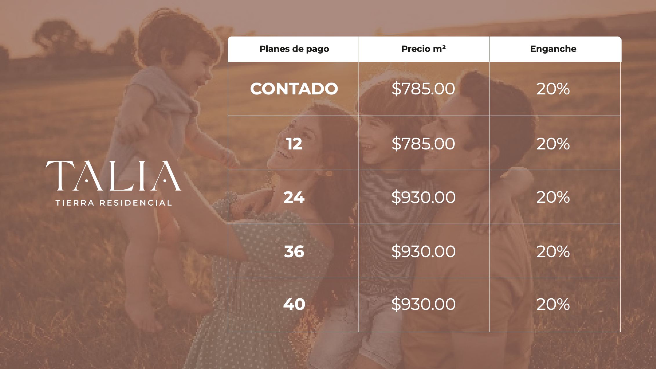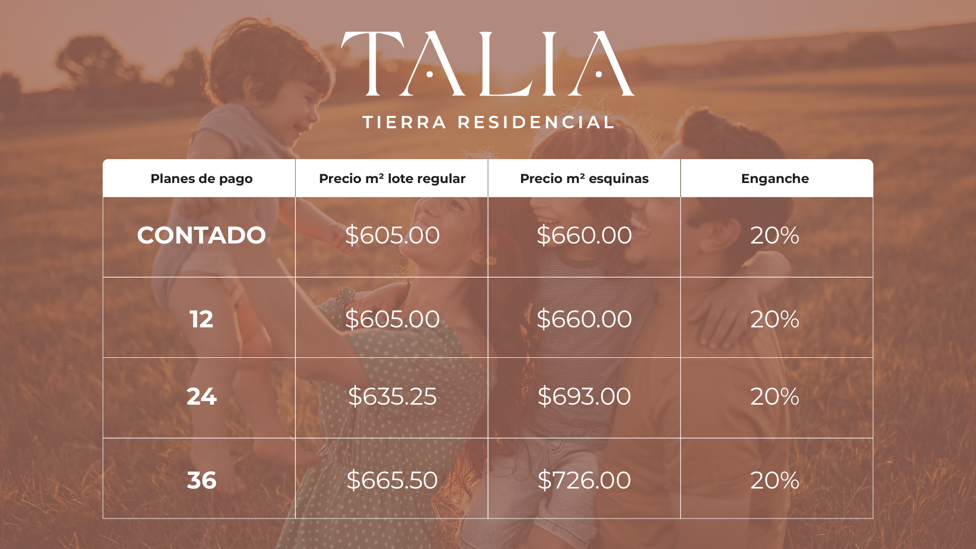 *Precios sujetos a cambios. El precio final será el pactado directamente con el asesor al momento de elegir el lote de su preferencia.
